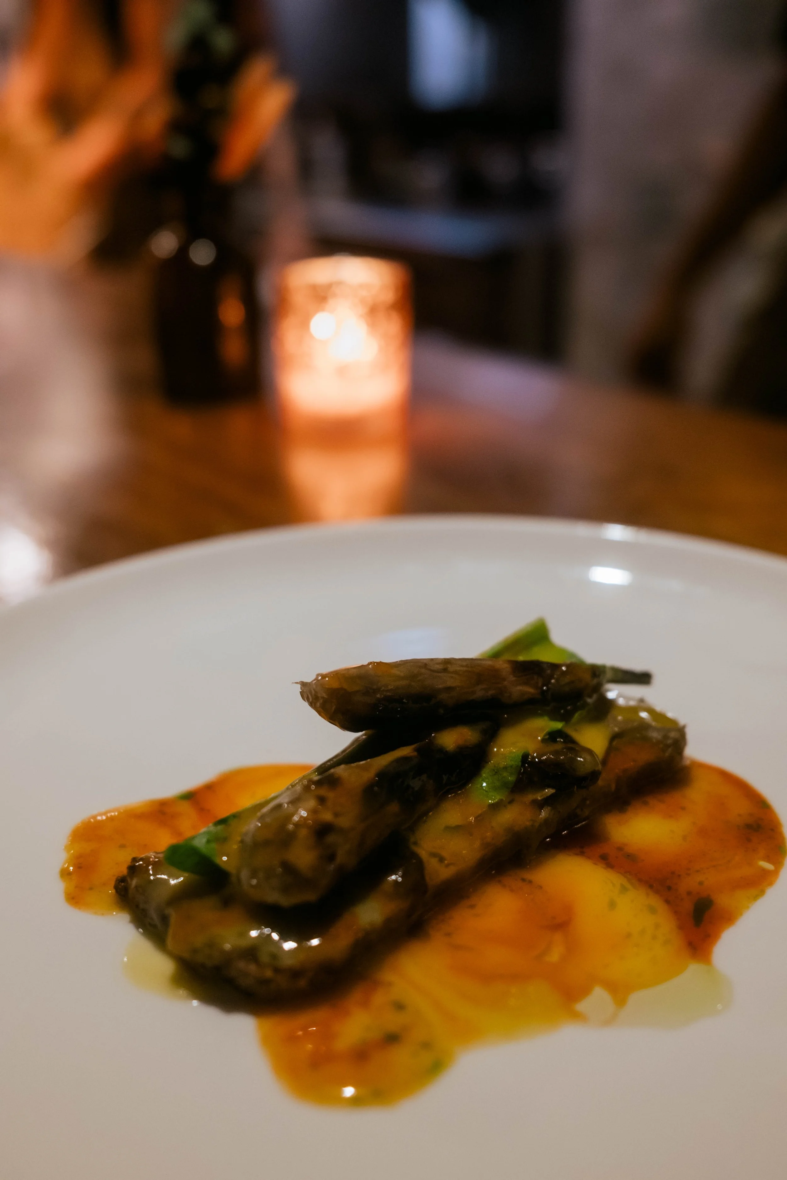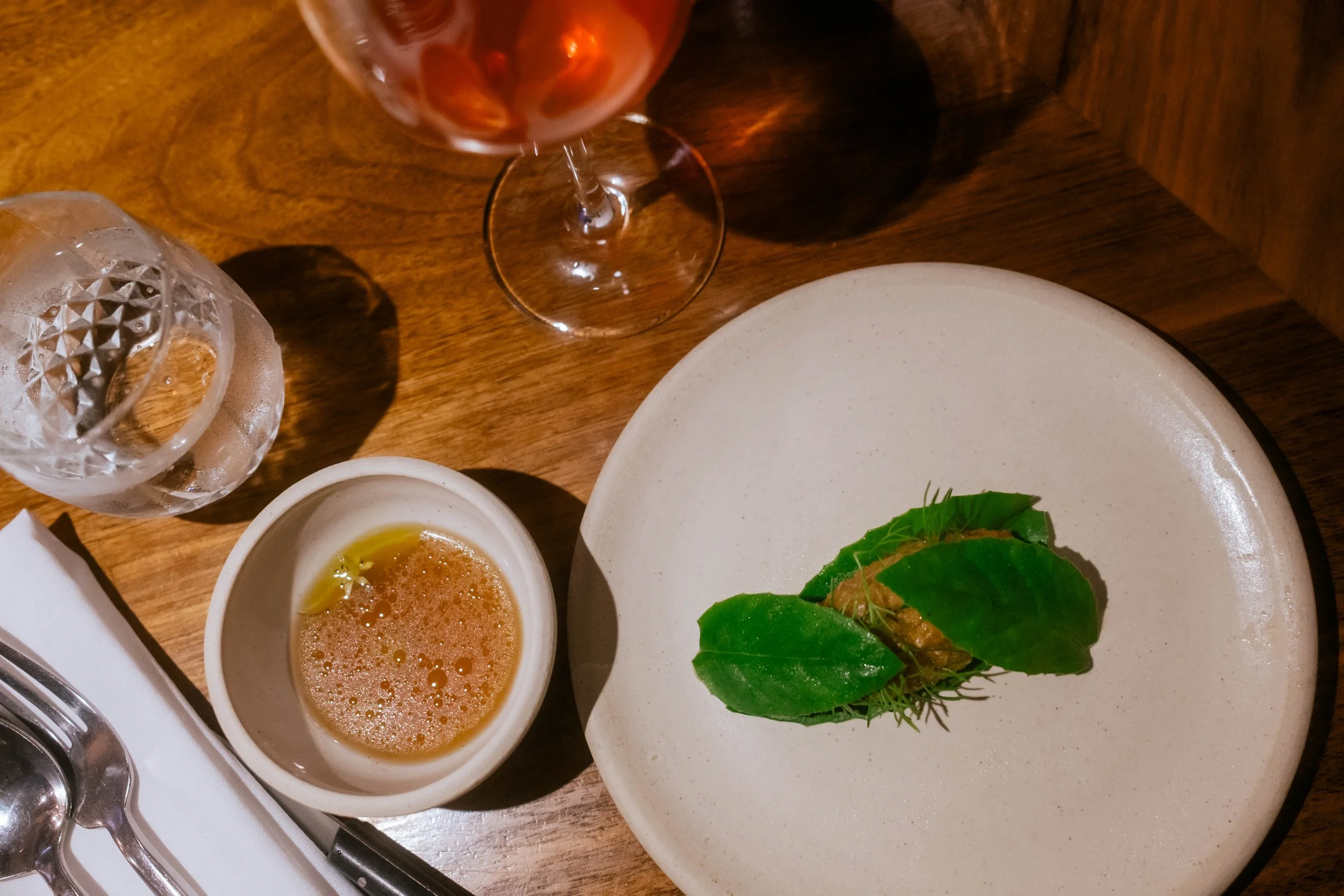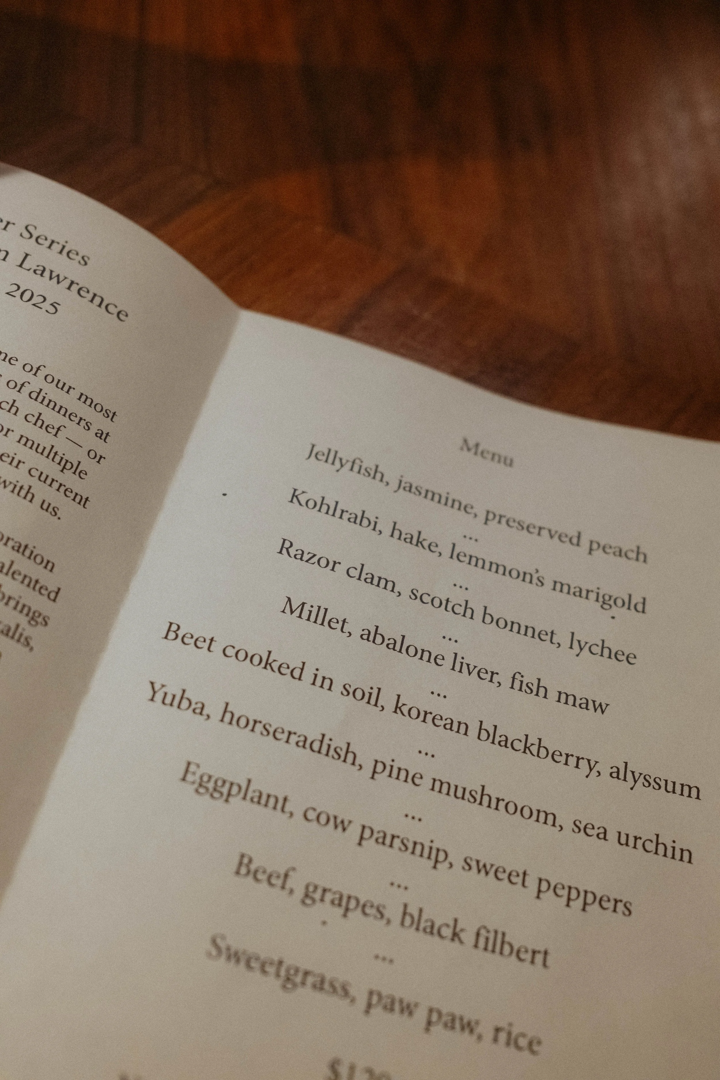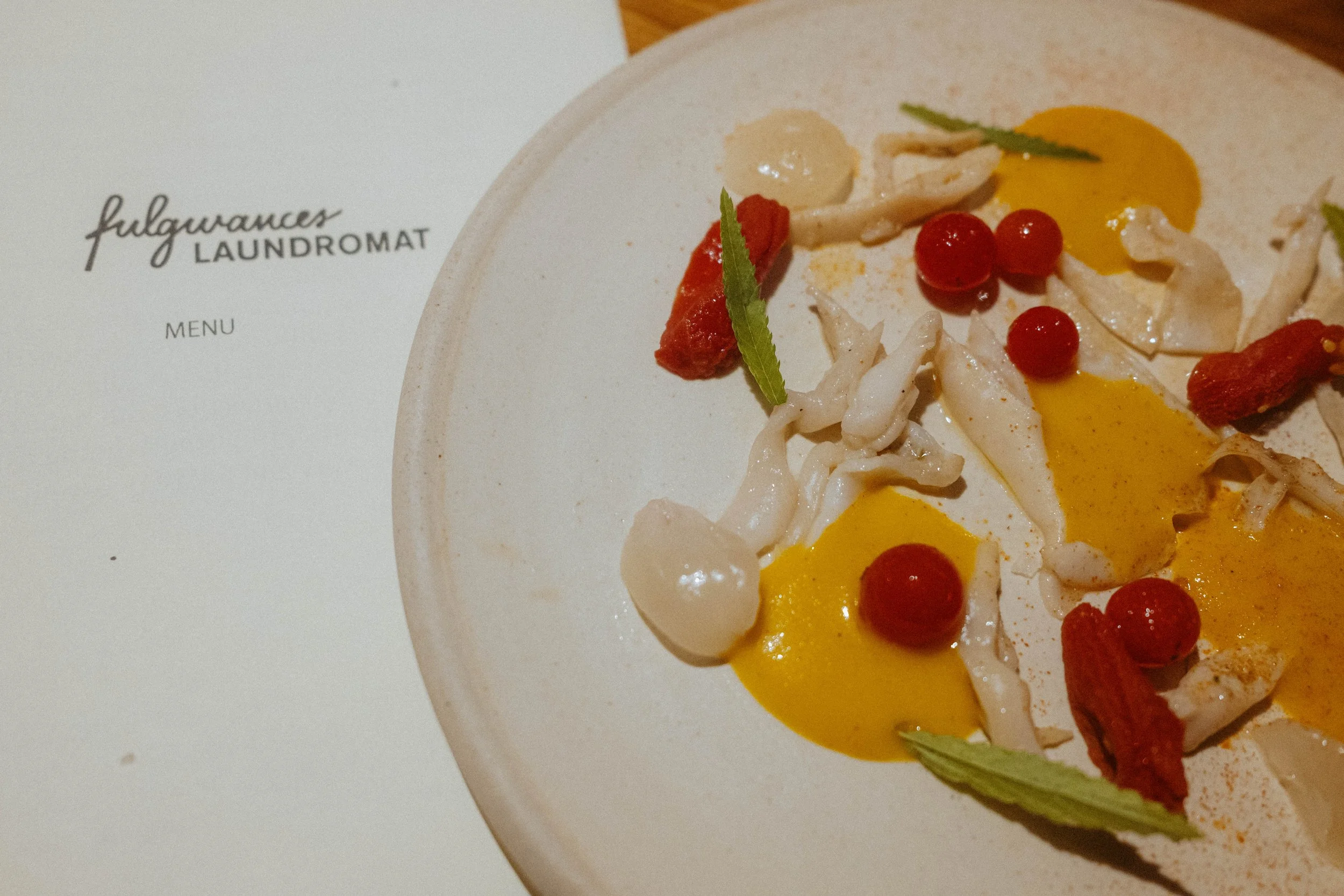 In September 2025, I returned to Fulgurances Laundromat with Scott Murry for a collaborative dinner series that brought together two divergent yet complementary approaches. Scott’s cooking, inventive and precise, carried the imprint of his upbringing in Asia—spices layered with intention, the electric hum of Sichuan peppercorn threaded through his dishes. My own contributions drew on what I had harvested in California and along the East Coast, as well as provisions gathered and preserved over years of travel, each ingredient carrying its own history. Together, the menus formed a conversation between memory and movement: landscapes distilled into flavor, familiar comforts set against the wild and the far-flung, each course a point of connection between our two paths.